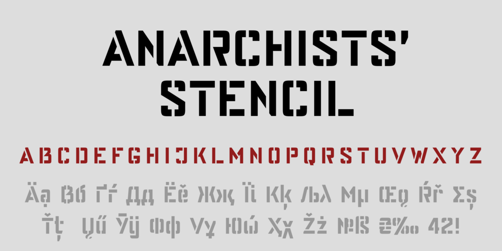 A stencil font with support for all European languages. A total of 556 glyphs are spread across Latin, Greek, and Cyrillic scripts. Clearly distinguishable from a distance, it provides a high contrast and readability.