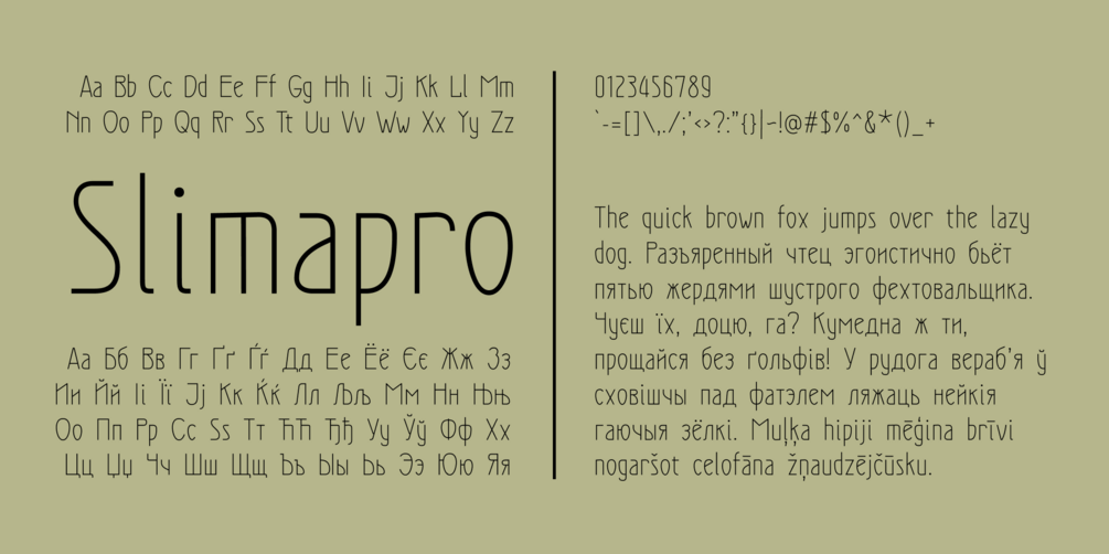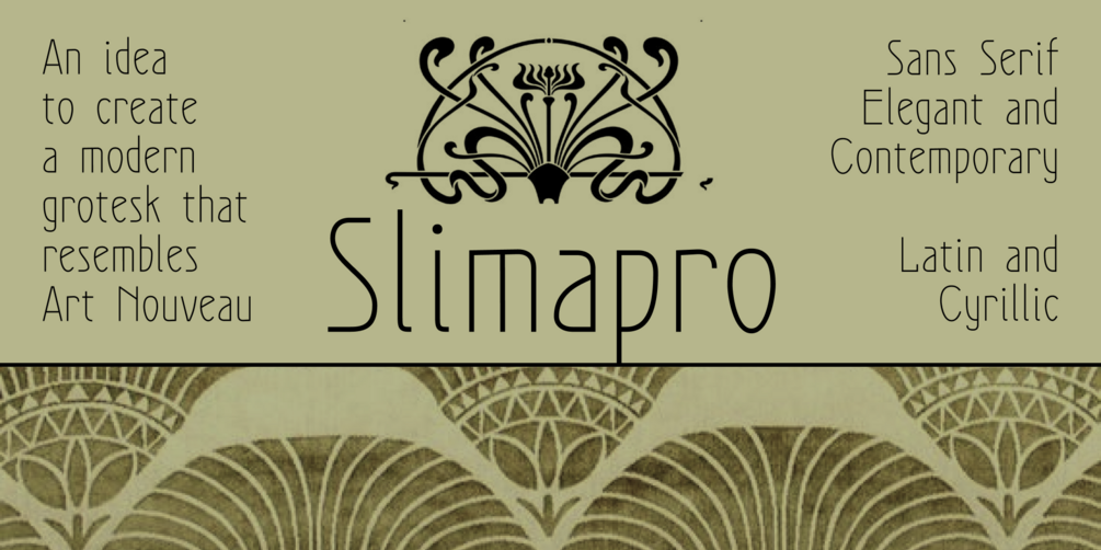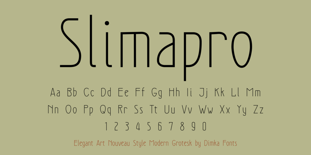 Slimapro is an elegant, contemporary sans-serif with a pronounced Art Nouveau style. It supports Latin and Cyrillic scripts.